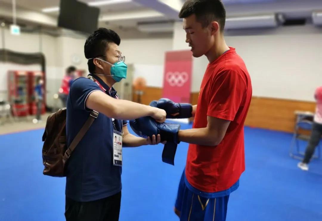 东京奥运会拳击热身馆,乐鱼(中国)leyu体育工作人员帮助运动员穿戴拳击手套
